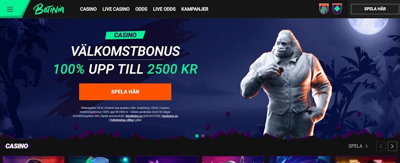 De som blir medlemmar hos Betinia kan välja att ta emot en av deras välkomstbonusar när de ger sin första insättning. Det finns en casinobonus och en oddsbonus att välja bland. Ha i åtanke att du måste omsätta din insättning en gång innan bonusen aktiveras på ditt konto.
