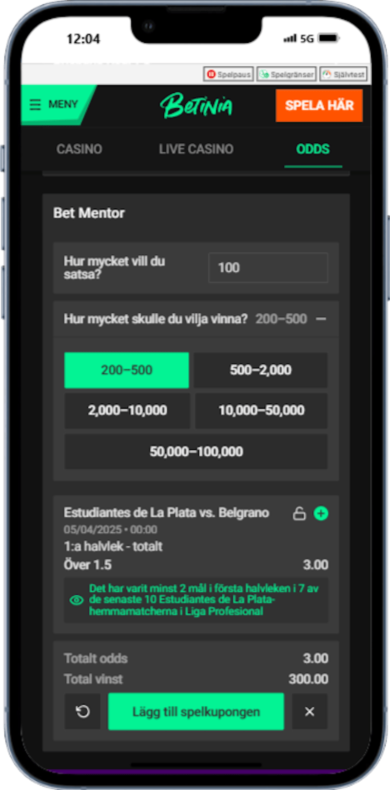 När du valt ett spelbolag och blivit medlem behöver du hitta Bet Mentor i sportsbooken. I mobilen scrollar du bara ned tills du hittar rutan, och på desktop ligger funktionen oftast i sidomenyn till vänster på skärmen, nedanför populära toppligor. När du hittat funktionen följer du dessa enkla steg: