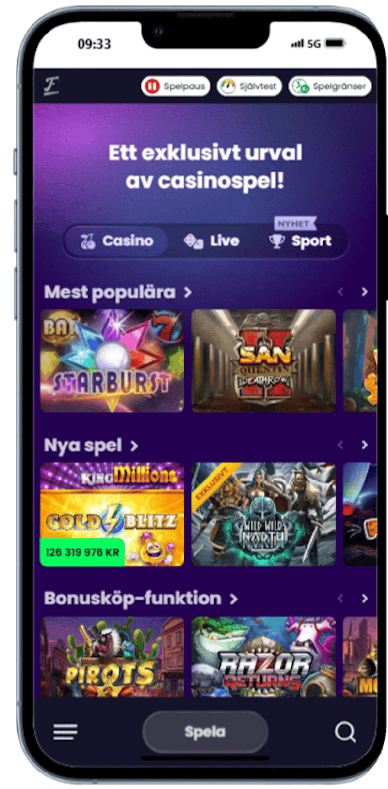 | Casinospel | Slots, bordsspel, livecasino |