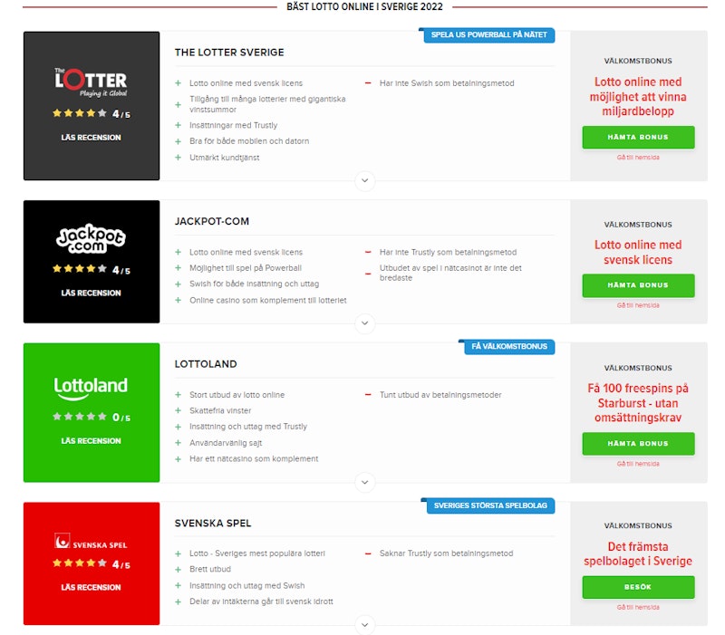Läs igenom våra recensioner för att skaffa dig en bättre bild av bolagens styrkor och svagheter om du känner dig osäker. Se vår topplista högst upp på denna sida för aktuella lotto spelbolag i Sverige.