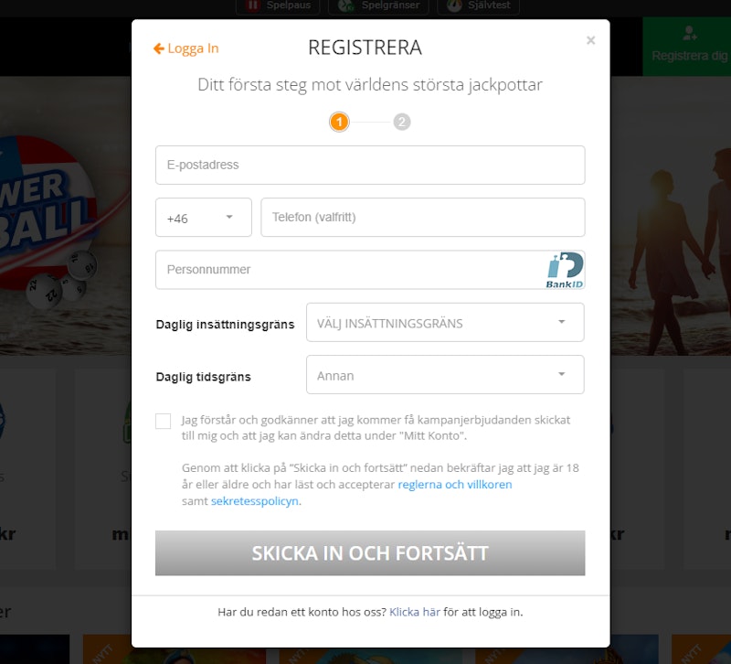 Därefter skapar du ett konto hos lotto online aktören som du har bestämt dig för. Klicka på "Registrera dig" (eller motsvarande) och registrera ett konto med hjälp av BankID.