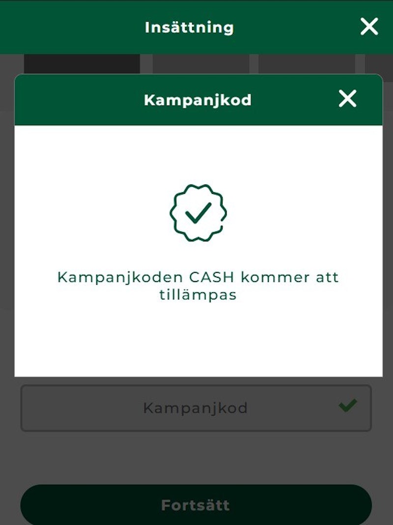 - Om du sätter in minst 500 SEK och istället använder bonuskoden "SPORT" så kan du få ett livebet värt 500 kronor att använda på ett live sportevenemang. Efter insättningen behöver du satsa 500 SEK med minimumoddset 1.80 för att få ditt live bet. Detta spel har inget omsättningskrav.