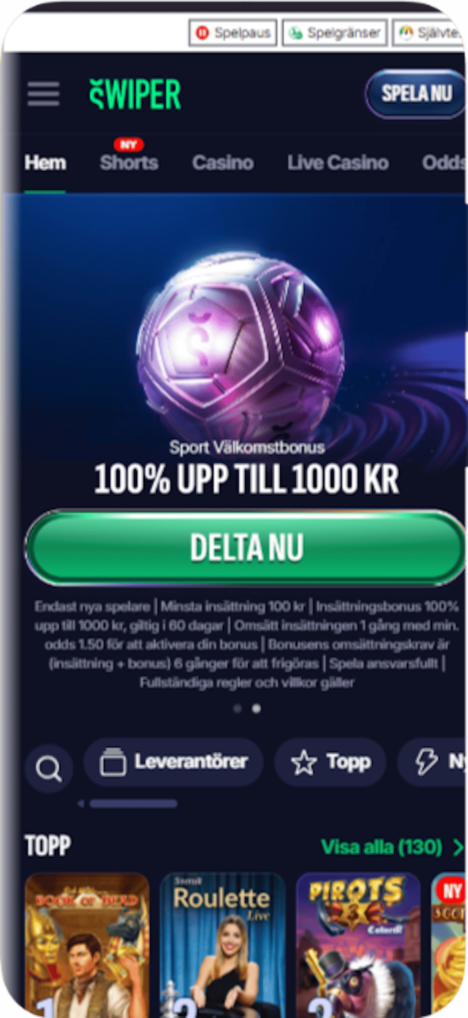 Swiper tycks ha lånat sitt namn från engelskans "swipe", alltså att svepa på mobilen. Denna teori får stöd av casinots unika funktion Shorts. Denna tiktok-liknande funktion låter spelare svepa mellan sekvenser från olika slots. Om något ser spännande ut är det bara att klicka sig vidare direkt till spelet. En kul funktion som funkar särskilt bra i mobilen.