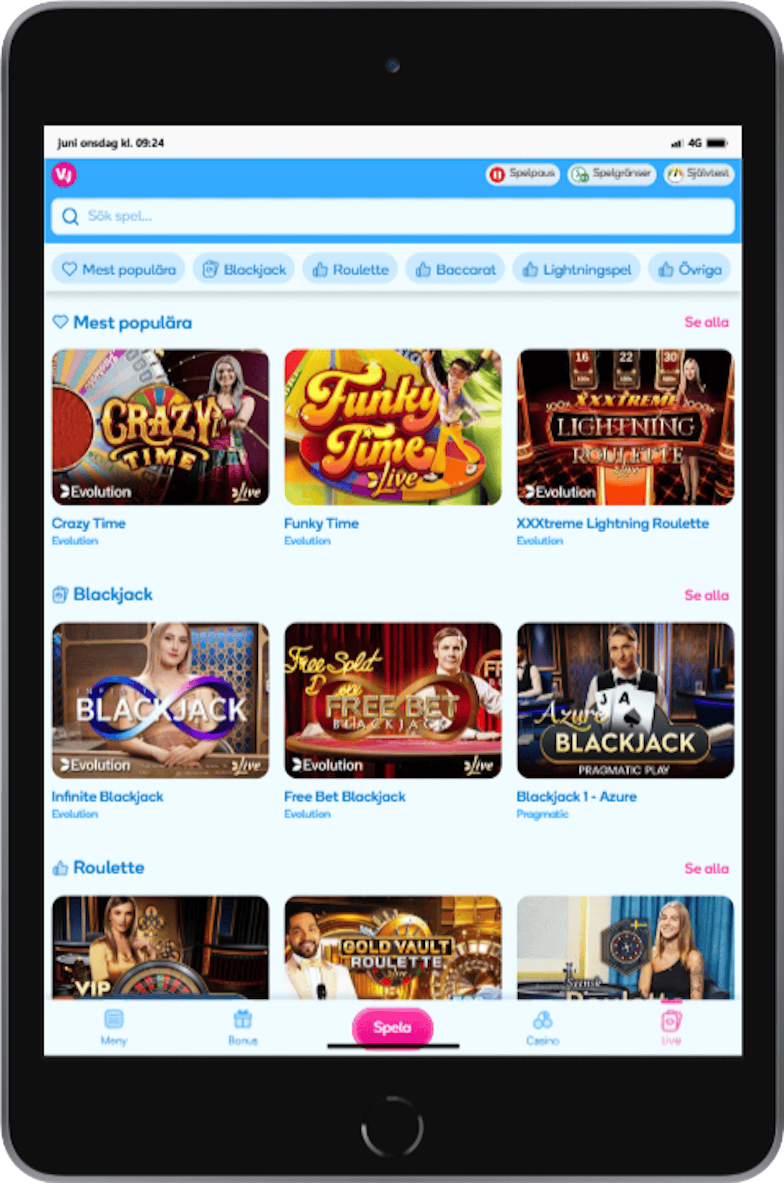 - Omsättningskrav 60x (30 bonus + 30 insättning)